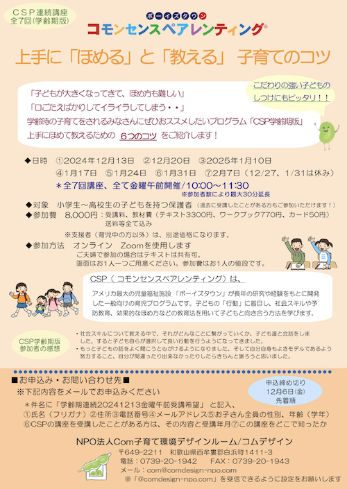 | 申込 | NPO法人Com子育て環境デザインルームへ、下記内容をメールでお申し込みください *件名に「学齢期連続20241213金曜午前 受講希望」 と記入、 ①氏名(フリガナ) ②住所 ③電話番号 ④メールアドレス ⑤お子さんの性別、年齢(学年) ⑥CSPの講座を受講したことがある方は、その内容と受講年月 ⑦差し支えなければこの講座をどこで知ったか ※こちらからのメール(com@comdesign-npo.com )を受信できるように設定をお願いします。 |