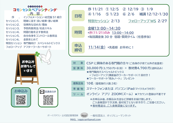 | 備考 | *ワーカーサポート(講座後のサポート):1回付き! *最終回は専門職向けスペシャルセッションです。 *お申込み後、お振込み方法など詳細をお届け致します。 ご入金確認ができ次第、受付完了となりますので、ご注意ください。 *補講は短縮版で実施いたします。(欠席分全てを扱えない場合もございます) |