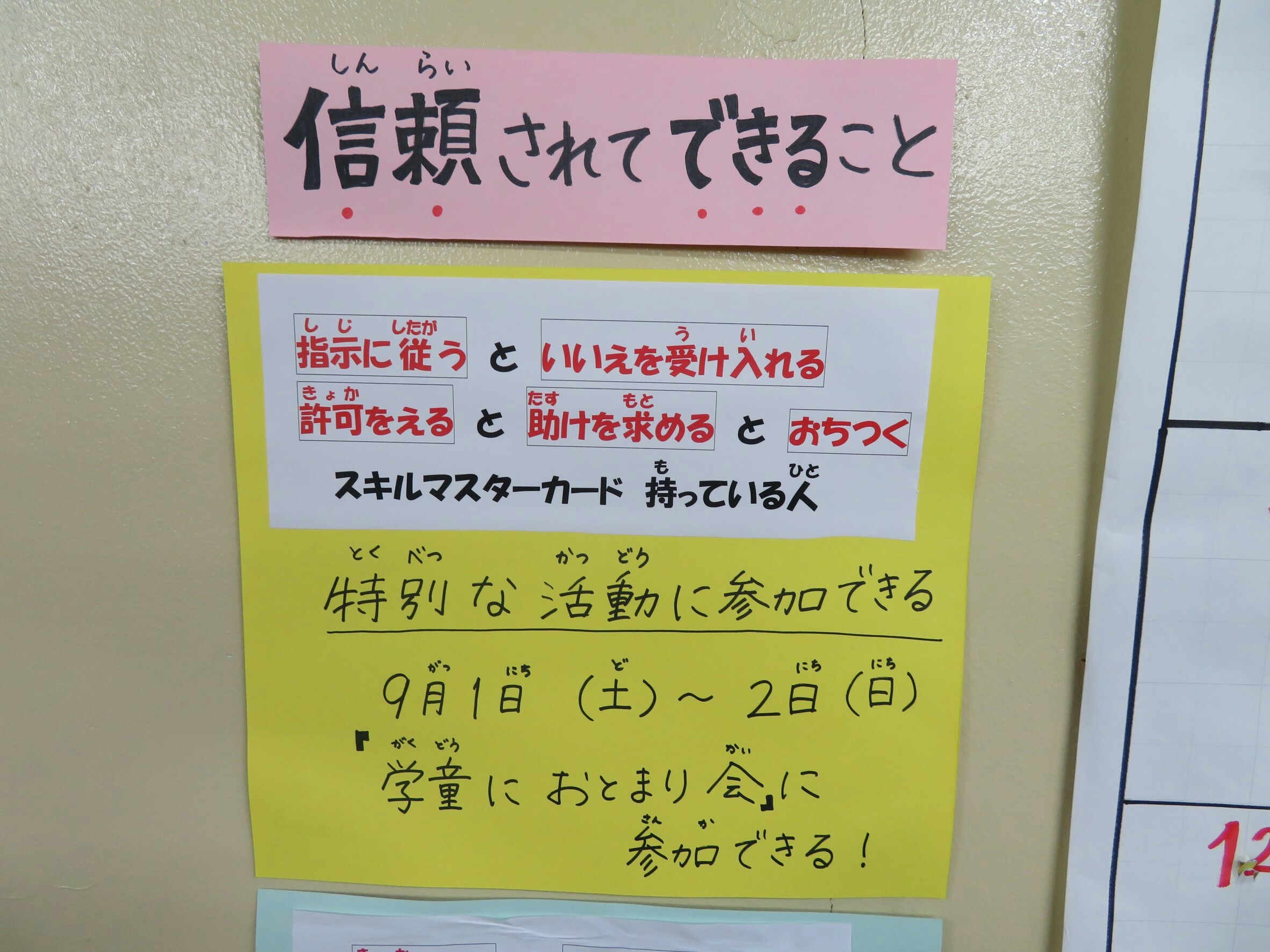 長期休みなどに実施される『全体のおでかけ』や『学年別の活動』に、活動に必要なスキル・ステップ・状況を練習すると活動に参加できます。