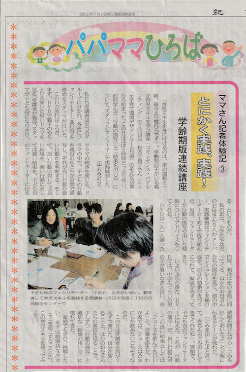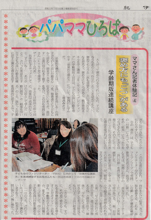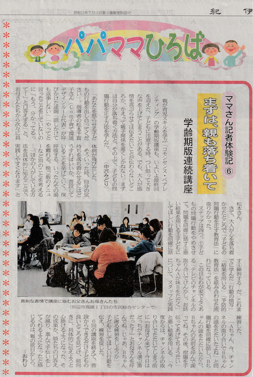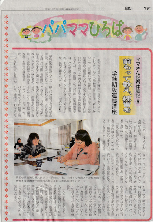 紀伊民報に認定団体のCom子育て環境デザインルームの学齢期版連続講座が連載として取り上げられました。