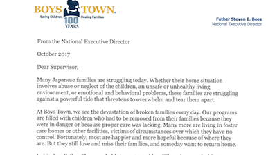 2017年10月6日〜8日に開催されるスーパービジョン研修に向けて、ボーイズタウン全米代表スティーブン・E・ベイ神父より日本の皆様へメッセージを頂戴しました。