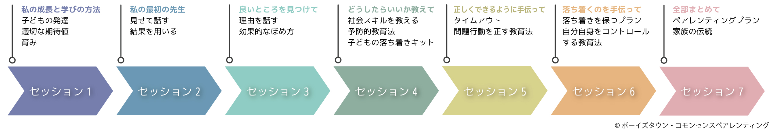 幼児版は全7セッション、学齢期版は全6セッションで講座が構成されています。全てのセッションは、その前のセッションで学んだ内容の積み重ねになっています。プログラムを修了する頃には、多くの子育ての悩みを解決するためのスキルやヒントを得ることができます。