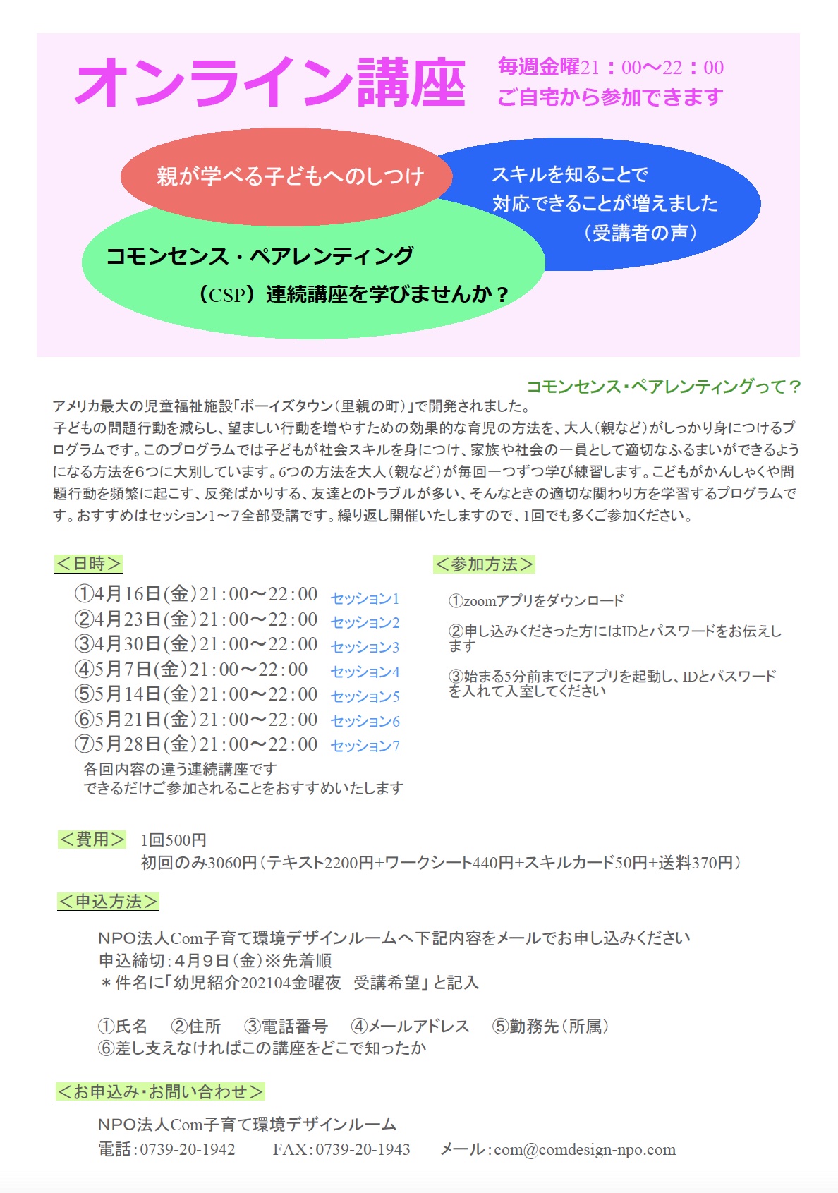 | 申込 | NPO法人Com子育て環境デザインルームへ、下記内容をメールでお申し込みください ①氏名(フリガナ) ②住所 ③電話番号 ④メールアドレス ⑤お子さんの性別、年齢(学年) ⑥CSPの講座を受講したことがある方は、その内容と受講年月 ⑦差し支えなければこの講座をどこで知ったか ※こちらからのメール(com@comdesign-npo.com )を受信できるように設定をお願いします。 |
