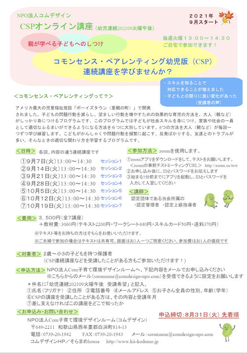 | 申込 | NPO法人Com子育て環境デザインルームへ、下記内容をメールでお申し込みください *件名に「幼児連続202109火曜午後 受講希望」 と記入、 ①氏名(フリガナ) ②住所 ③電話番号 ④メールアドレス ⑤お子さんの性別、年齢(学年) ⑥CSPの講座を受講したことがある方は、その内容と受講年月 ⑦差し支えなければこの講座をどこで知ったか ※こちらからのメール(com@comdesign-npo.com )を受信できるように設定をお願いします。 |