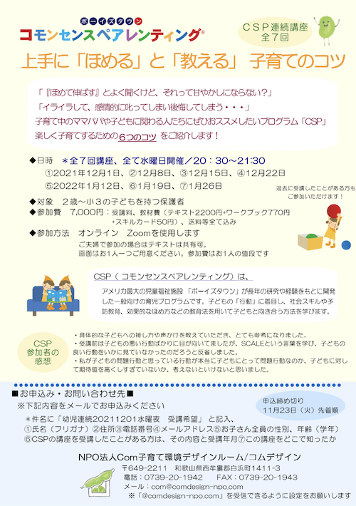 | 申込 | NPO法人Com子育て環境デザインルームへ、下記内容をメールでお申し込みください *件名に「幼児連続20211201 水曜夜受講希望」 と記入、 ①氏名(フリガナ) ②住所 ③電話番号 ④メールアドレス ⑤お子さんの性別、年齢(学年) ⑥CSPの講座を受講したことがある方は、その内容と受講年月 ⑦差し支えなければこの講座をどこで知ったか ※こちらからのメール(com@comdesign-npo.com )を受信できるように設定をお願いします。 |