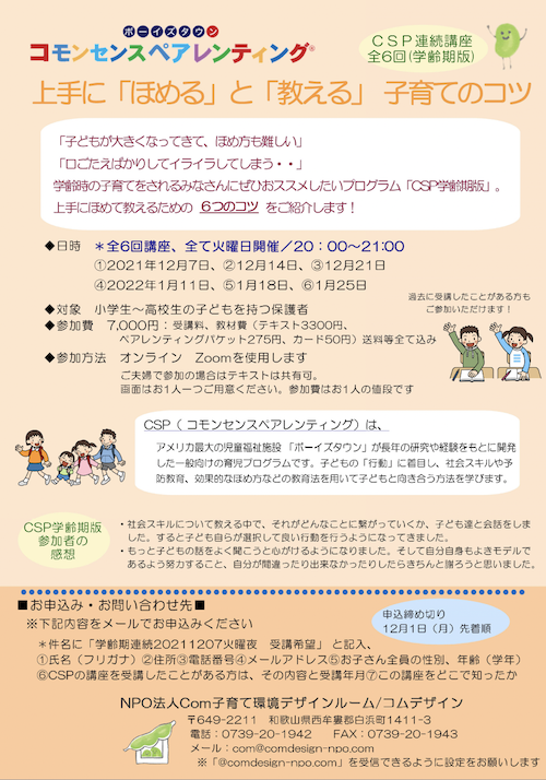 | 申込 | NPO法人Com子育て環境デザインルームへ、下記内容をメールでお申し込みください 件名に「学齢期連続20211207火曜夜 受講希望」と記入、 ①氏名(フリガナ) ②住所 ③電話番号 ④メールアドレス ⑤お子さんの性別、年齢(学年) ⑥CSPの講座を受講したことがある方は、その内容と受講年月 ⑦差し支えなければこの講座をどこで知ったか ※こちらからのメール(com@comdesign-npo.com)を受信できるように設定をお願いします。 |