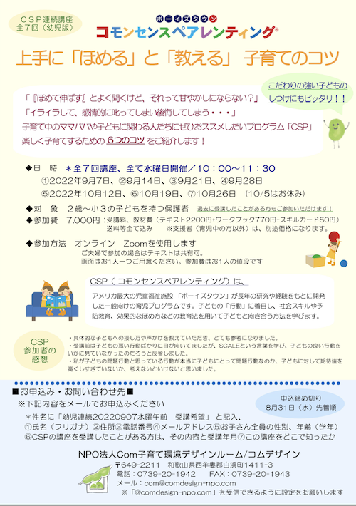 | 申込 | NPO法人Com子育て環境デザインルームへ、下記内容をメールでお申し込みください *件名に「幼児連続20220907幼児水曜午前 受講希望」 と記入、 ①氏名(フリガナ) ②住所 ③電話番号 ④メールアドレス ⑤お子さんの性別、年齢(学年) ⑥CSPの講座を受講したことがある方は、その内容と受講年月 ⑦差し支えなければこの講座をどこで知ったか ※こちらからのメール(com@comdesign-npo.com )を受信できるように設定をお願いします。 |