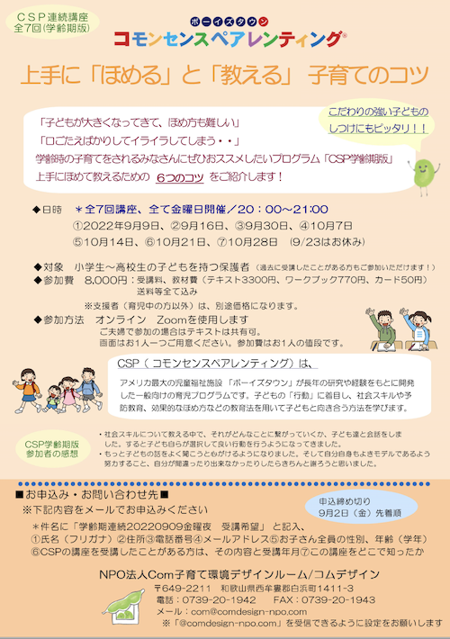 | 申込 | NPO法人Com子育て環境デザインルームへ、下記内容をメールでお申し込みください *件名に「幼児連続20220909学齢期金曜夜 受講希望」 と記入、 ①氏名(フリガナ) ②住所 ③電話番号 ④メールアドレス ⑤お子さんの性別、年齢(学年) ⑥CSPの講座を受講したことがある方は、その内容と受講年月 ⑦差し支えなければこの講座をどこで知ったか ※こちらからのメール(com@comdesign-npo.com )を受信できるように設定をお願いします。 |