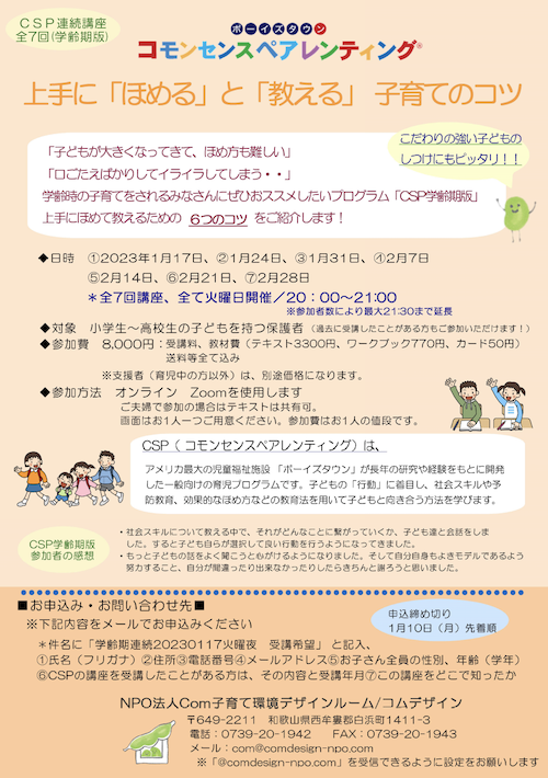 | 申込 | NPO法人Com子育て環境デザインルームへ、下記内容をメールでお申し込みください *件名に「学齢期連続20230117火曜夜受講希望」 と記入、 ①氏名(フリガナ) ②住所 ③電話番号 ④メールアドレス ⑤お子さんの性別、年齢(学年) ⑥CSPの講座を受講したことがある方は、その内容と受講年月 ⑦差し支えなければこの講座をどこで知ったか ※こちらからのメール(com@comdesign-npo.com )を受信できるように設定をお願いします。 |