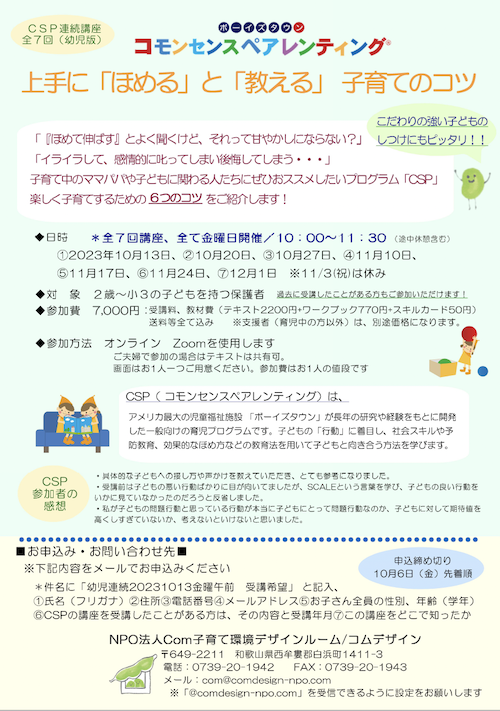 | 申込 | NPO法人Com子育て環境デザインルームへ、下記内容をメールでお申し込みください 件名に「幼児連続20231013金曜午前受講希望」と記入、 ①氏名(フリガナ) ②住所 ③電話番号 ④メールアドレス ⑤お子さんの性別、年齢(学年) ⑥CSPの講座を受講したことがある方は、その内容と受講年月 ⑦差し支えなければこの講座をどこで知ったか ※こちらからのメール(com@comdesign-npo.com)を受信できるように設定をお願いします。 |