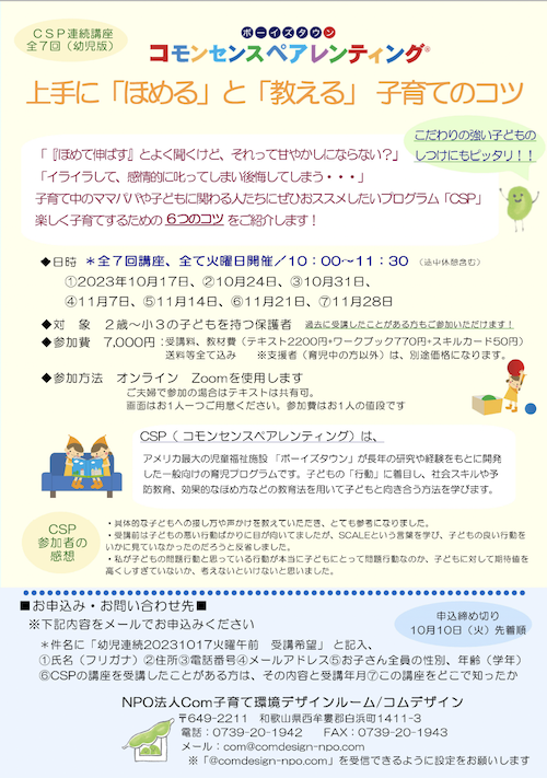 | 申込 | NPO法人Com子育て環境デザインルームへ、下記内容をメールでお申し込みください 件名に「幼児連続20231017火曜午前受講希望」と記入、 ①氏名(フリガナ) ②住所 ③電話番号 ④メールアドレス ⑤お子さんの性別、年齢(学年) ⑥CSPの講座を受講したことがある方は、その内容と受講年月 ⑦差し支えなければこの講座をどこで知ったか ※こちらからのメール(com@comdesign-npo.com)を受信できるように設定をお願いします。 |