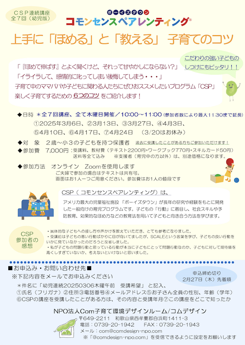 | 申込 | NPO法人Com子育て環境デザインルームへ、下記内容をメールでお申し込みください 件名に「幼児連続20250306木曜午前 受講希望」と記入、 ①氏名(フリガナ) ②住所 ③電話番号 ④メールアドレス ⑤お子さんの性別、年齢(学年) ⑥CSPの講座を受講したことがある方は、その内容と受講年月 ⑦差し支えなければこの講座をどこで知ったか ※こちらからのメール(com@comdesign-npo.com)を受信できるように設定をお願いします。 |