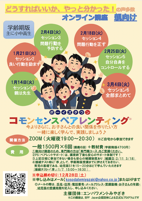 | 受講料 | 一般 1,500円×6回(講義6回)+教材費(学齢期版 4,700円) |