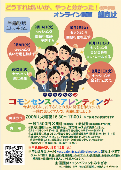| 受講料 | 一般 1,500円×6回(講義6回)+教材費(学齢期版 4,700円) |