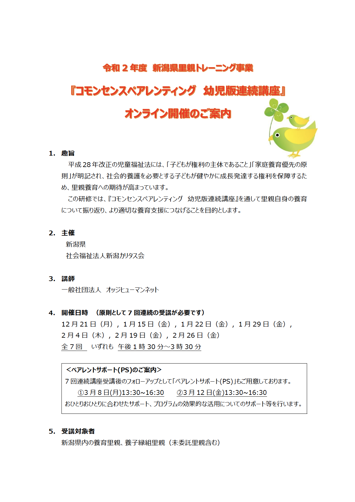 | 対象者 | 新潟県内の養育里親・養子縁組里親限定(未委託里親含む) |