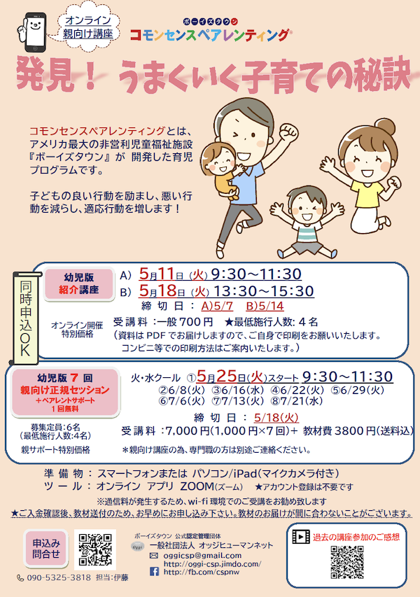 | 受講料 | 子育て中の親御さん 1,000円×7回+教材費 3,800円(送料込み) |