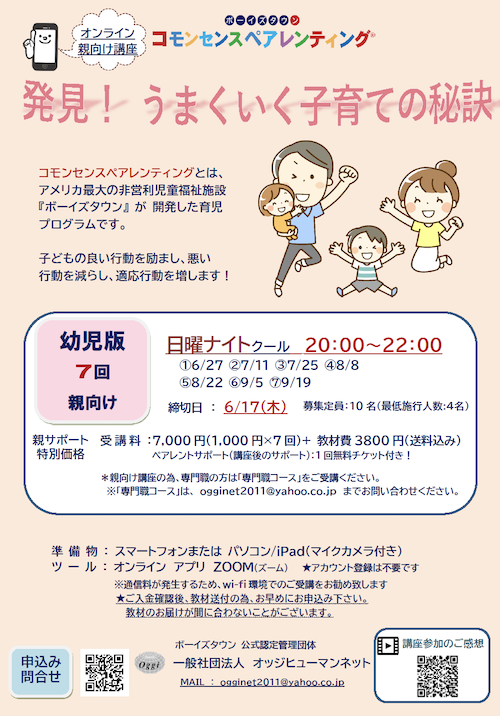 | 受講料 | 子育て中の親御さん 1000円×7回+教材費 3800円(送料込み) |