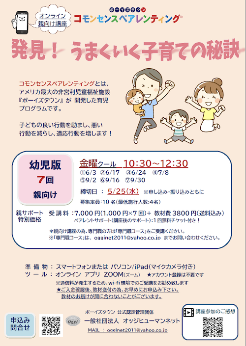 | 備考 | *ペアレントサポート(講座後のサポート):1回無料チケット付き! *親向け講座の為、専門職の方は「専門職コース」をご受講ください。 *お申し込み後に、詳細をお届け致します。 尚、受講料お振込み順に、受講確定となります。 |