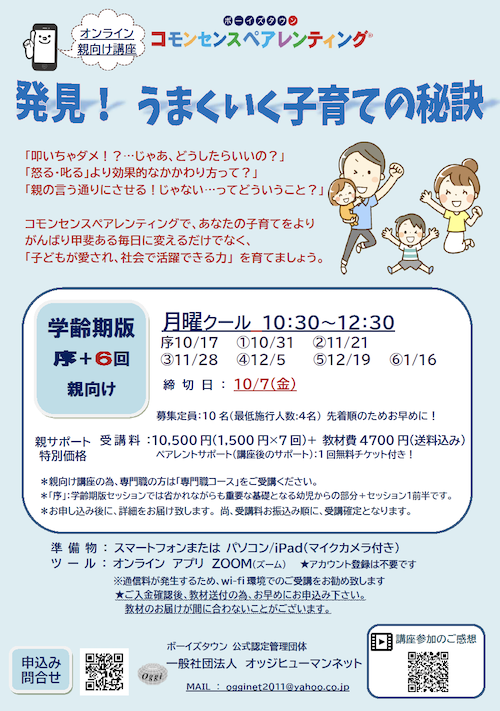| 備考 | *ペアレントサポート(講座後のサポート):1回無料チケット付き! *親向け講座の為、専門職の方は「専門職コース」をご受講ください。 *お申し込み後に、詳細をお届け致します。 尚、受講料お振込み順に、受講確定となります。 |
