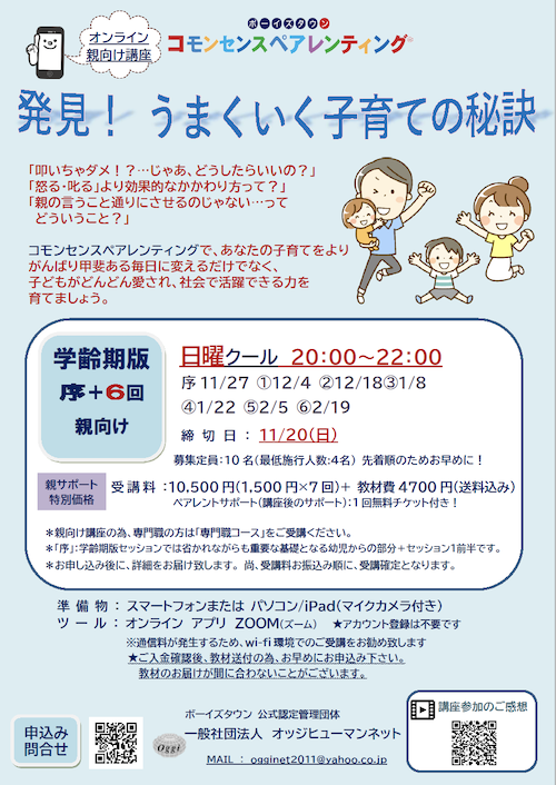 | 備考 | *ペアレントサポート(講座後のサポート):1回無料チケット付き! *親向け講座の為、専門職の方は「専門職コース」をご受講ください。 *お申し込み後に、詳細をお届け致します。 尚、受講料お振込み順に、受講確定となります。 |