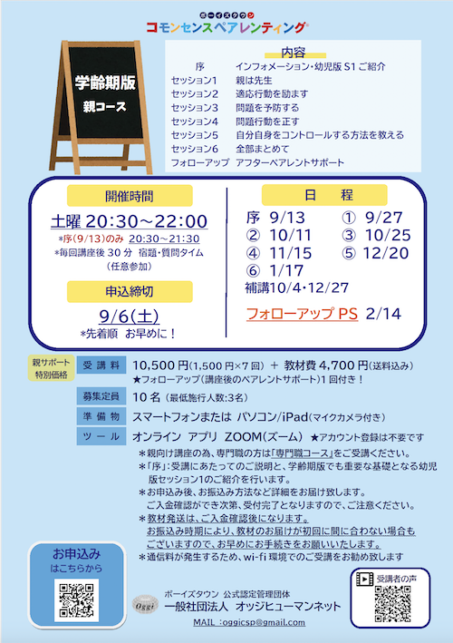 | 備考 | *ペアレントサポート(講座後のサポート):1回付き! *親向けのコースの為、専門職の方は「専門職コース」をご受講ください。 *お申込み後、お振込み方法など詳細をお届け致します。 ご入金確認ができ次第、受付完了となりますので、ご注意ください。 *補講は短縮版で実施いたします。(欠席分全てを扱えない場合もございます) |